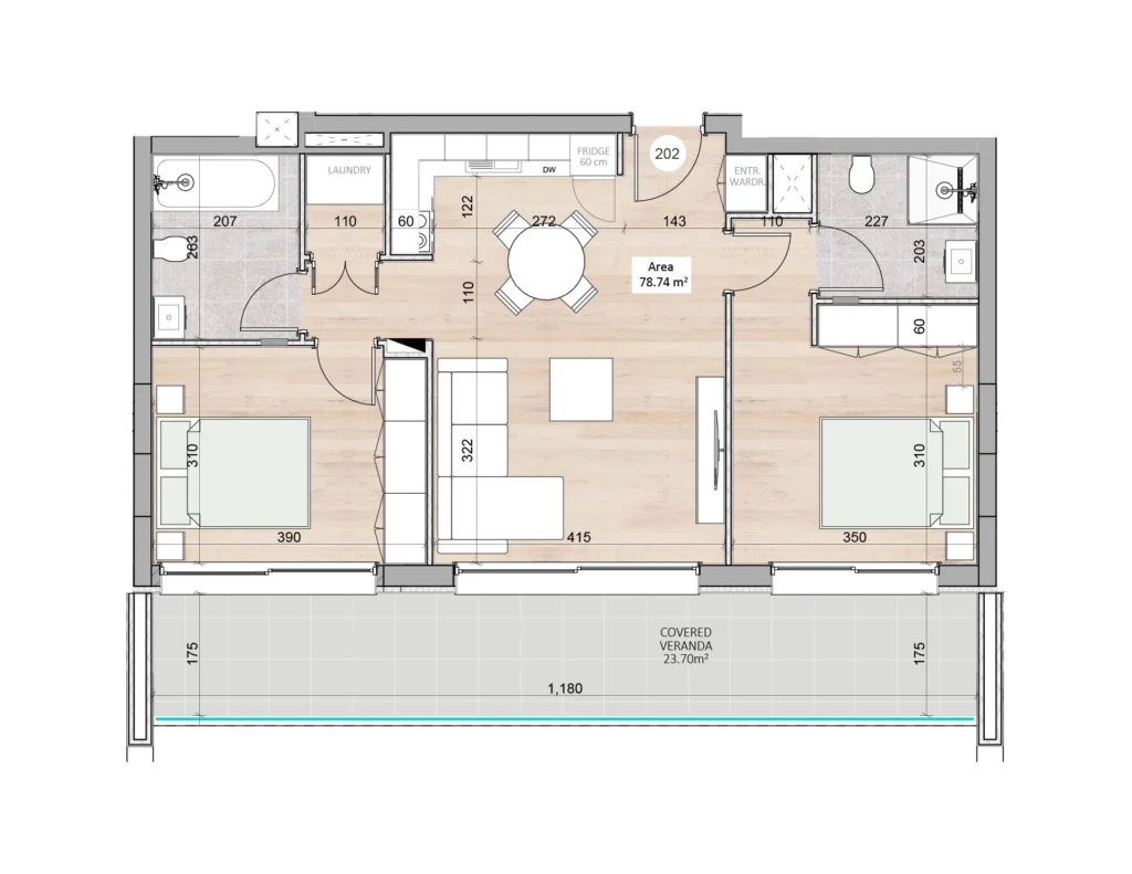 Two-bedroom apartment 202, with a living area of 78.38 m², is located on the second floor of a four-storey building in Block A.