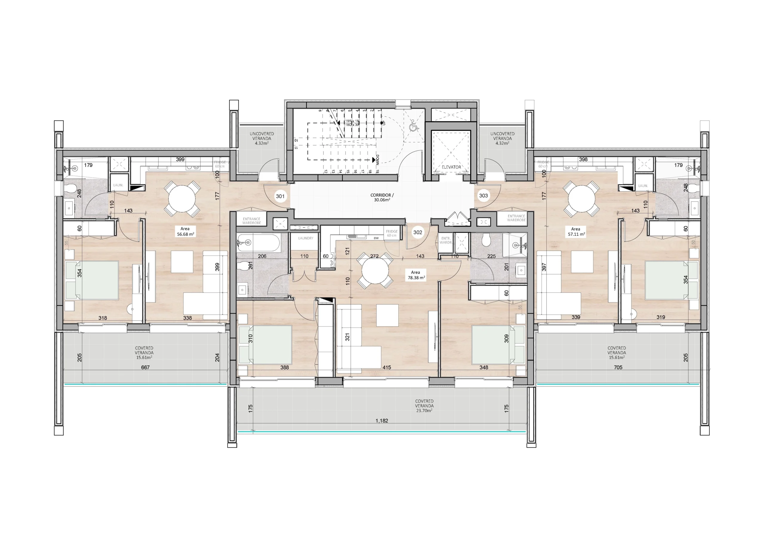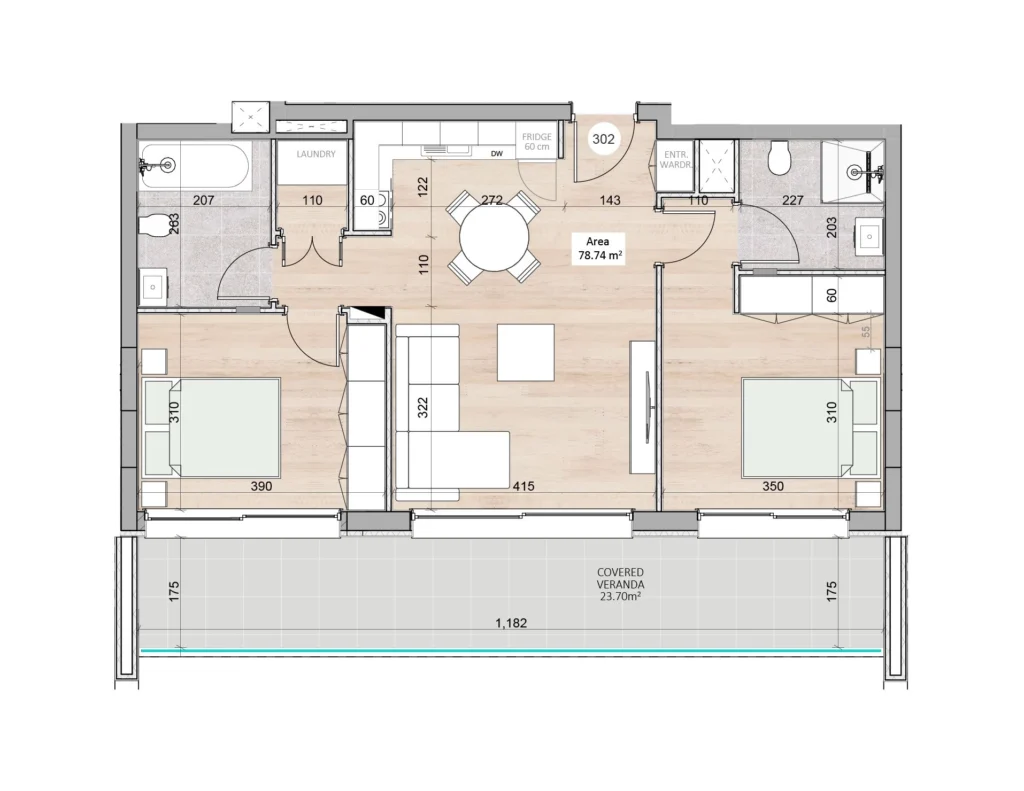 Two-bedroom apartment 302, with a living area of 78.38 m², is located on the third floor of a four-storey building in Block A.
