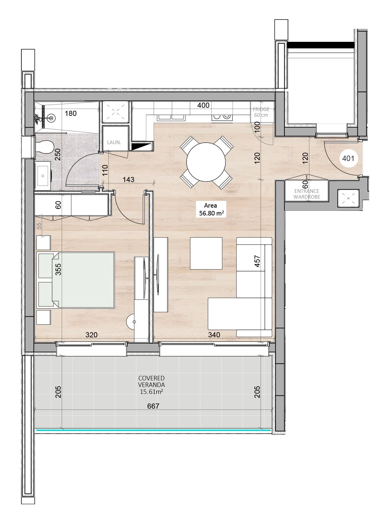 One-bedroom apartment 401, with a living area of 56.68 m², is located on the fourth floor of a four-storey building in Block A.