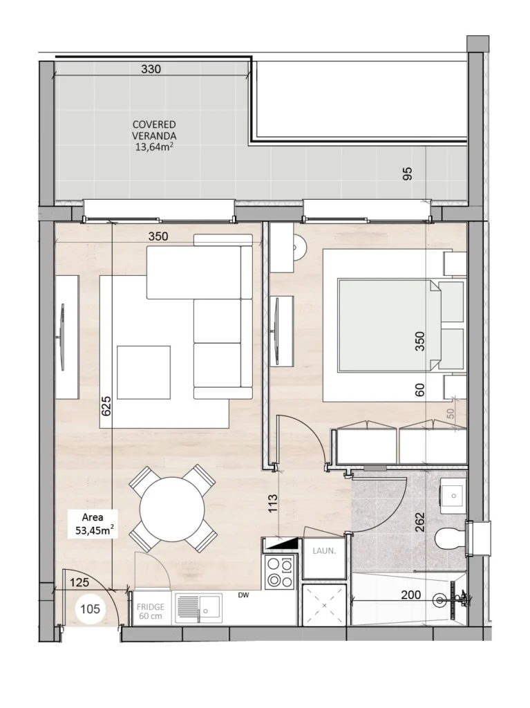 One-bedroom apartment 105, with a living area of 53.45 m², is located on the first floor of a four-storey building in Block B.
