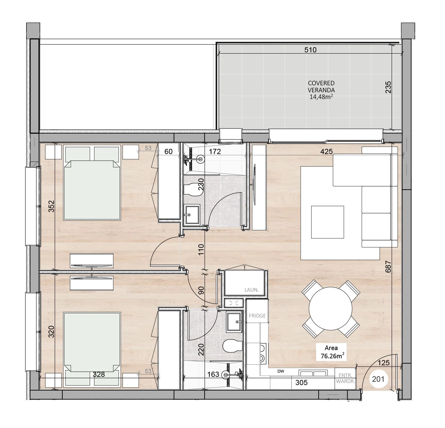 Two-bedroom apartment 201, with a living area of 76.07 m², is located on the second floor of a four-storey building in Block B.