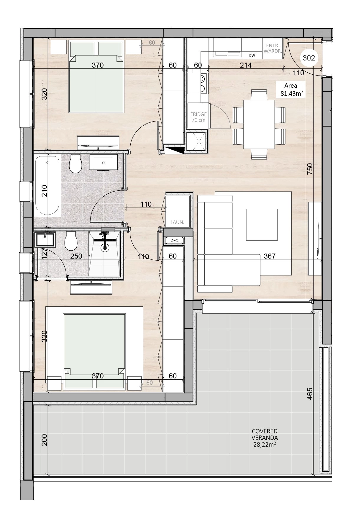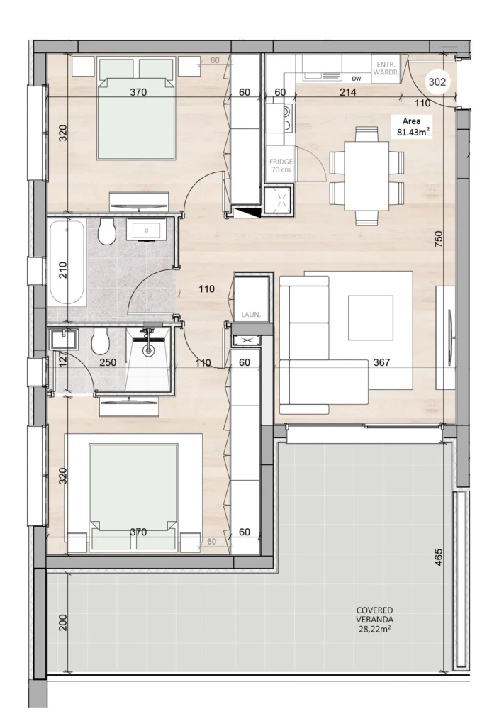 Two-bedroom apartment 302, with a living area of 81.08 m², is located on the third floor of a four-storey building in Block B.