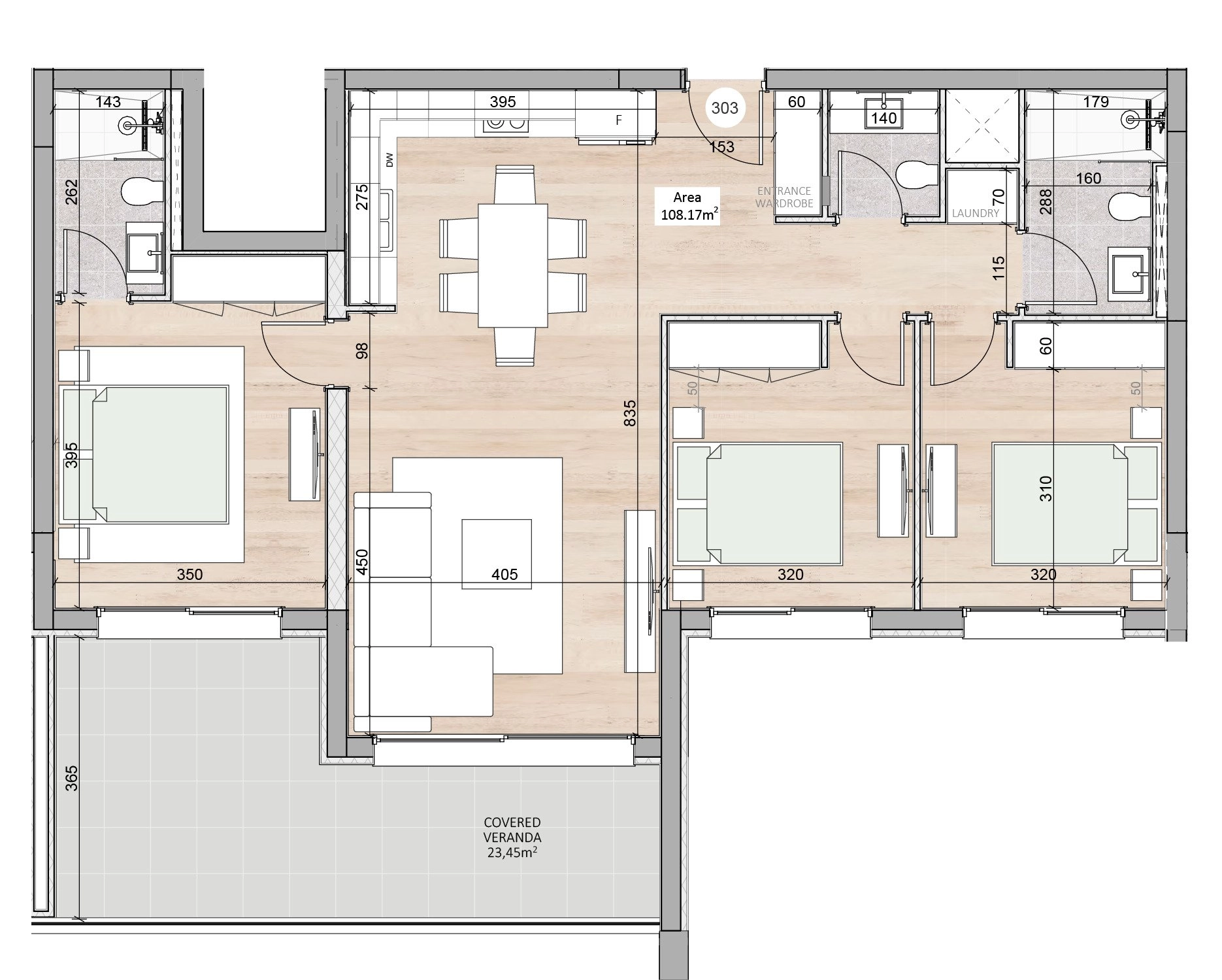 Three-bedroom apartment 303, with a living area of 106.9 m², is located on the third floor of a four-storey building in Block B.