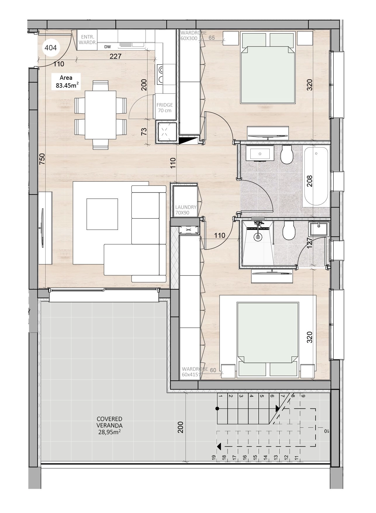 Two-bedroom penthouse 404, with an internal area of 83.1 m² and a 79.57 m² roof garden, is located on the fourth floor of a four-storey building in Block B.