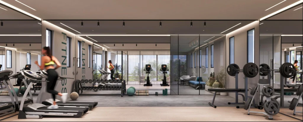 Residents enjoy resort-style amenities including a large swimming pool, fully equipped gym, yoga and wellness areas, sauna, ice bath, café, children’s playground, and walking paths through lush greenery.