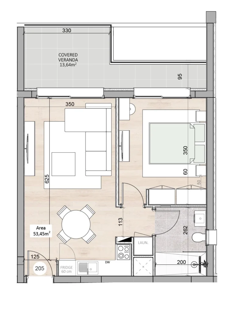 The apartment features a bright open-plan living and dining area, a fully equipped kitchen, one spacious bedroom, and a well-appointed bathroom. Large windows bring in abundant natural light, while a private veranda provides the perfect space for relaxation.