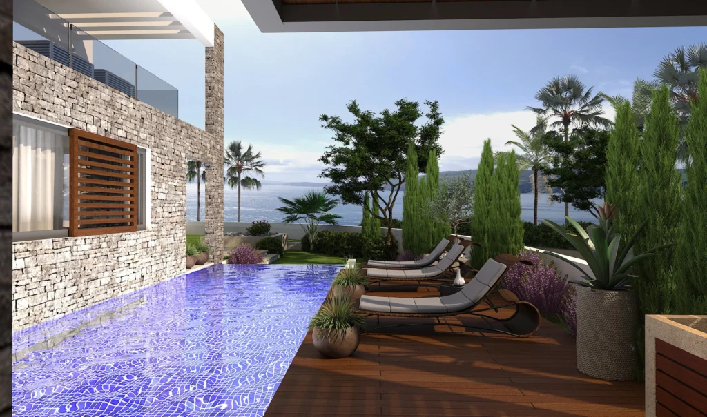Positioned directly by a beautiful sandy lagoon beach that allows swimming even during the winter months, each villa enjoys unobstructed sea views, a private infinity swimming pool, and elegant modern architecture designed for comfort and sophistication.