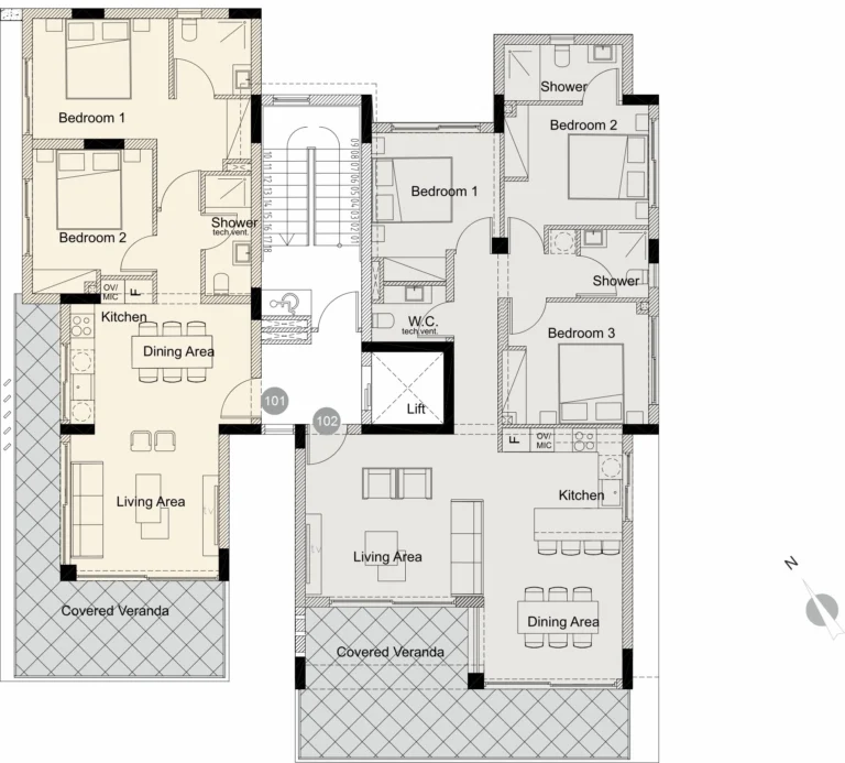 Each apartment features its own covered veranda, perfect for relaxing and enjoying the surrounding views, while covered parking ensures convenience and protection for residents’ vehicles.