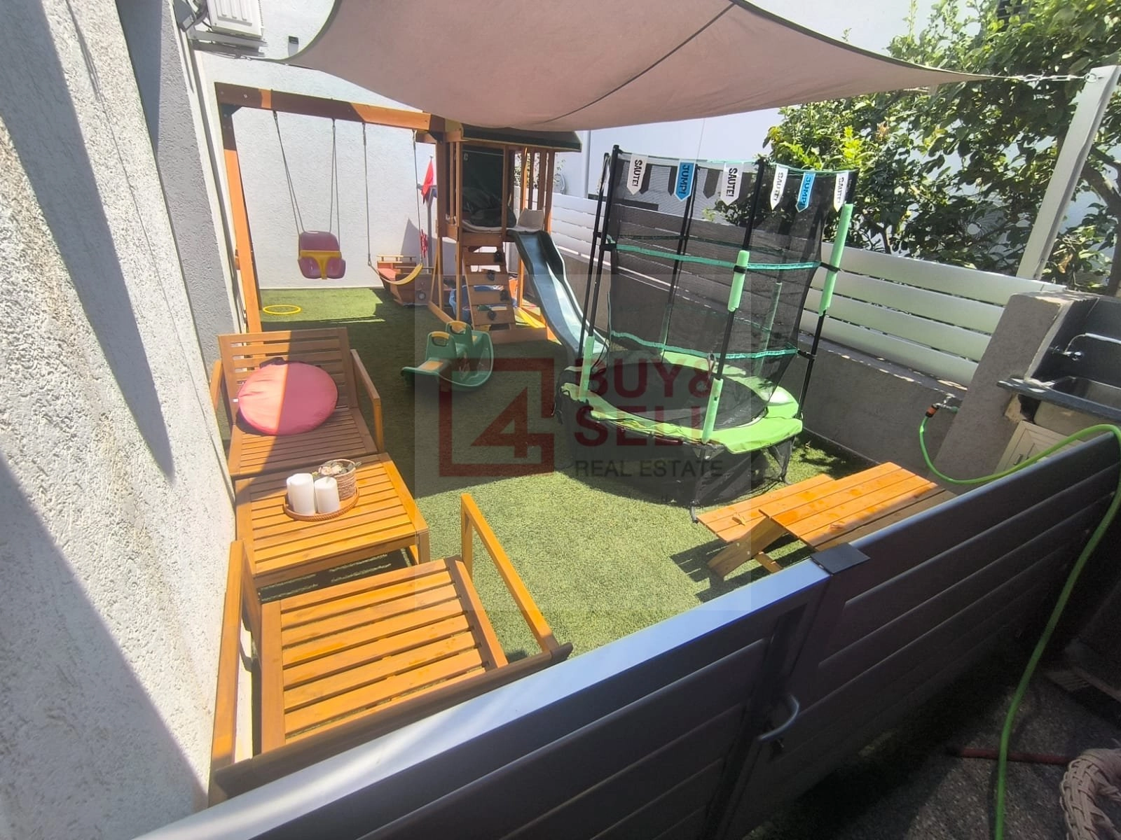 Outdoors, the property features a landscaped garden with artificial grass, a BBQ area, and multiple parking spaces (2 covered + 2 uncovered). The front entrance is complemented by an elegant garden, creating a warm and welcoming atmosphere.