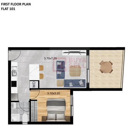 It features an open-plan living and kitchen area, one bedroom, and one family bathroom.