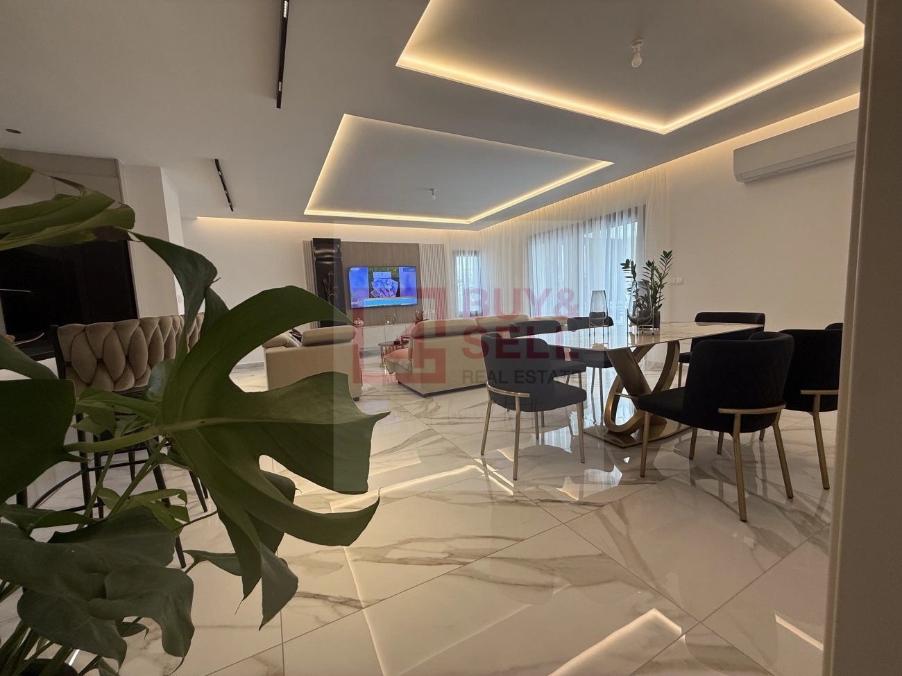 Inside, the property offers a bright and spacious living area with a modern open-plan kitchen fully equipped with high-quality appliances and a stylish dining area. There is also a separate second kitchen (utility room) with full appliances and a guest toilet.