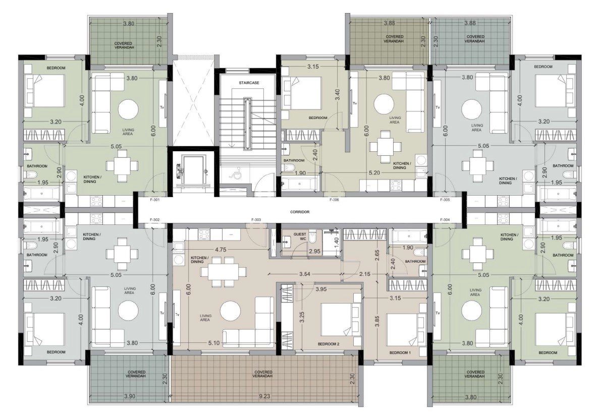The complex features six futuristic residential apartment blocks with a variety of cozy studios, and spacious one- and two-bedroom apartments, all designed with high-quality finishes. Each residence is crafted to provide maximum comfort and style, blending modern aesthetics with functional spaces.
