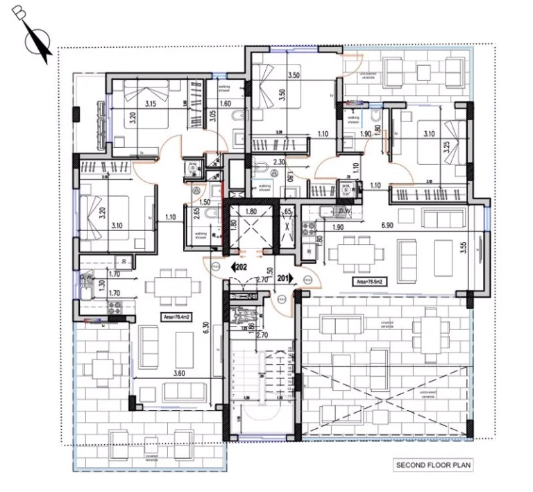 Two-bedroom apartment 202, with an internal area of 78.4 m², is located on the second floor of a three-storey building.