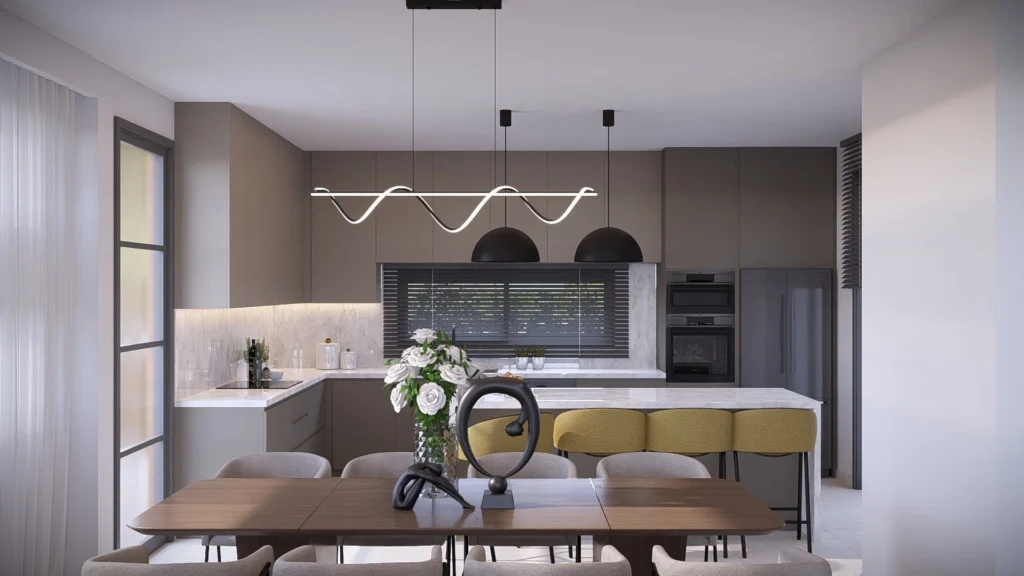 The living area serves as the heart of the home — open, inviting, and perfect for gatherings — while the kitchen showcases modern cabinetry, sleek surfaces, and space for culinary creativity.