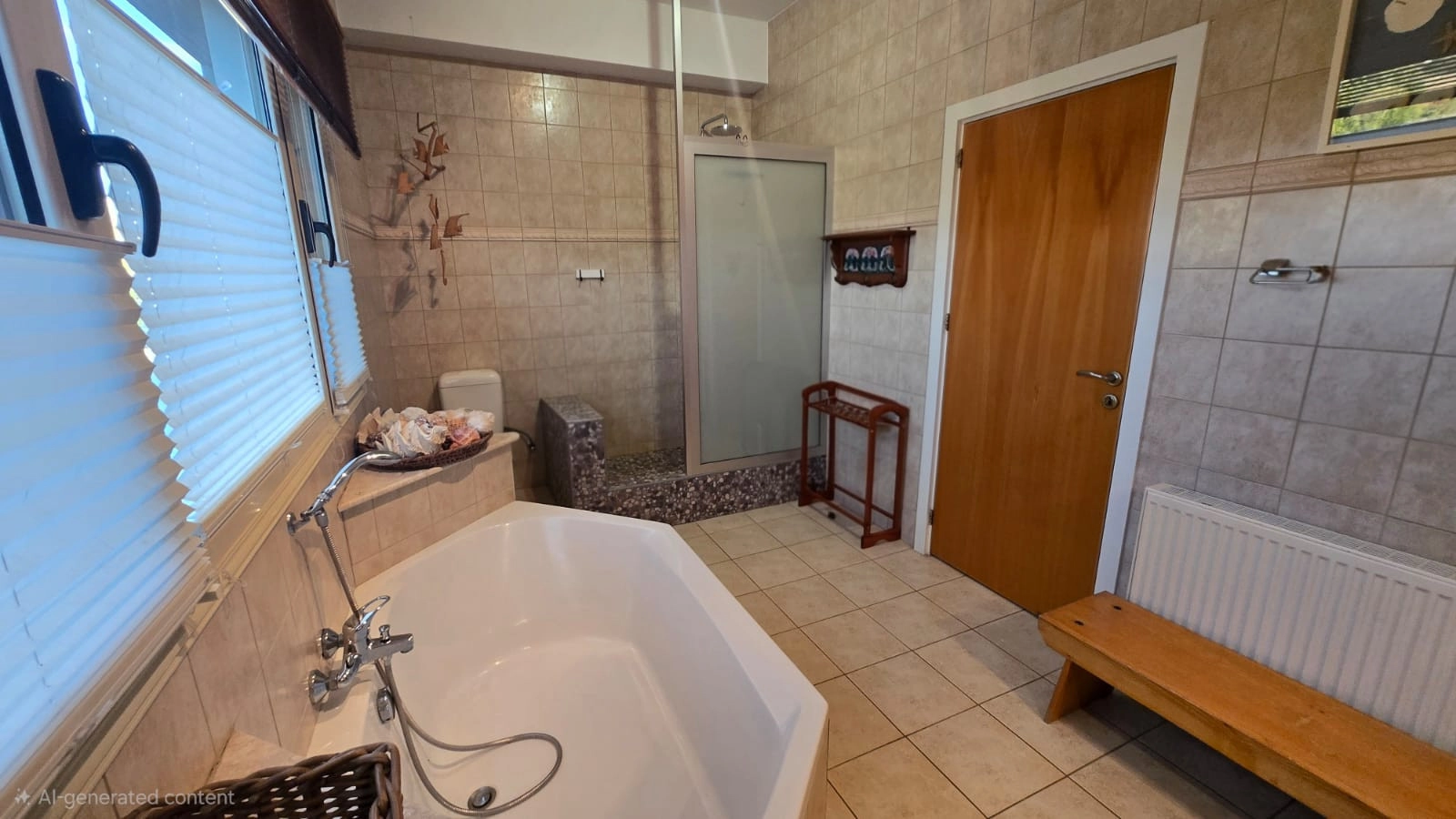 The first floor offers four very spacious bedrooms: one with a walk-in closet; one currently used as an office that can easily be converted back into a bedroom; another very spacious bedroom with pool and garden view; and the primary bedroom with a large walk-in closet and a generous en-suite shower room. A family bathroom includes both a shower and a bathtub. A small room on this level—originally intended as a guest WC—remains as storage. Three of the bedrooms open onto a large balcony overlooking the garden and pool.