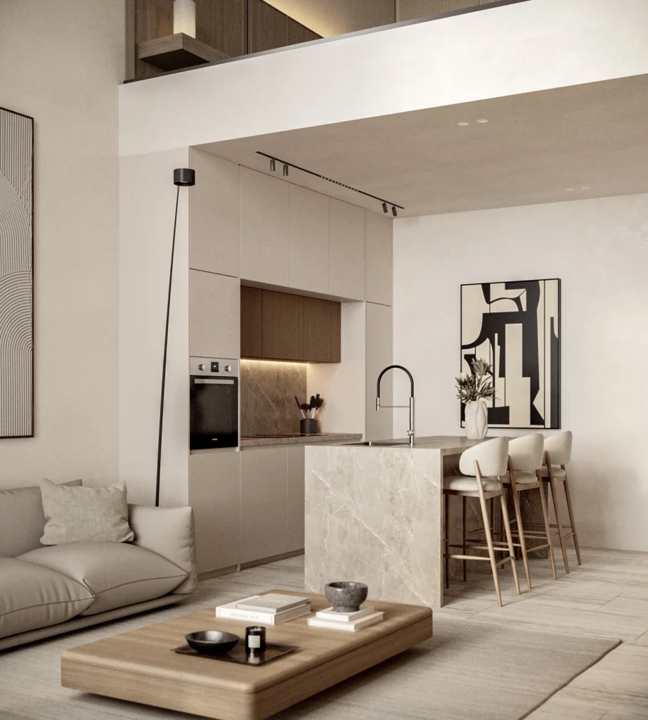 The open-plan living area merges with the kitchen and dining space, leading effortlessly to the outdoor terrace.