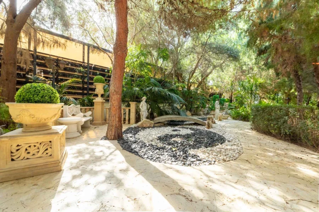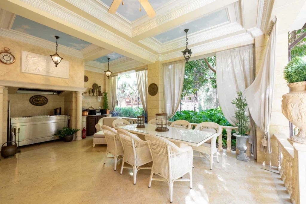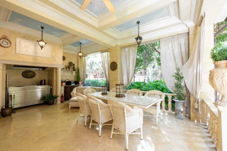 This exquisite two-story Mediterranean villa blends elegance, comfort, and modern functionality within a private, beautifully landscaped estate. Surrounded by mature trees, manicured gardens, and detailed stonework, the residence offers serenity and exclusivity, ideal for luxurious living and entertaining. The grand entrance foyer welcomes you with sophistication, featuring an elevator and two well-appointed offices for convenience. A separate living area with a fireplace adds warmth and character, while the layout flows seamlessly into a gourmet kitchen with an additional kitchenette. Adjacent is a bright winter garden that doubles as a tranquil fitness area. Upstairs, four spacious bedrooms provide exceptional comfort, including two master suites with private bathrooms and two bedrooms sharing an elegant family bathroom. The main master suite features an office corner, walk-in wardrobe, and a large bathroom with a shower and sauna. It opens onto a charming veranda with picturesque garden views. Additional features include a basement with a fully equipped laundry, a separate apartment, and a two-car garage with a server room. Outdoors, manicured gardens, a summer house, swimming pool, and shaded seating areas ensure comfort, privacy, and timeless sophistication.