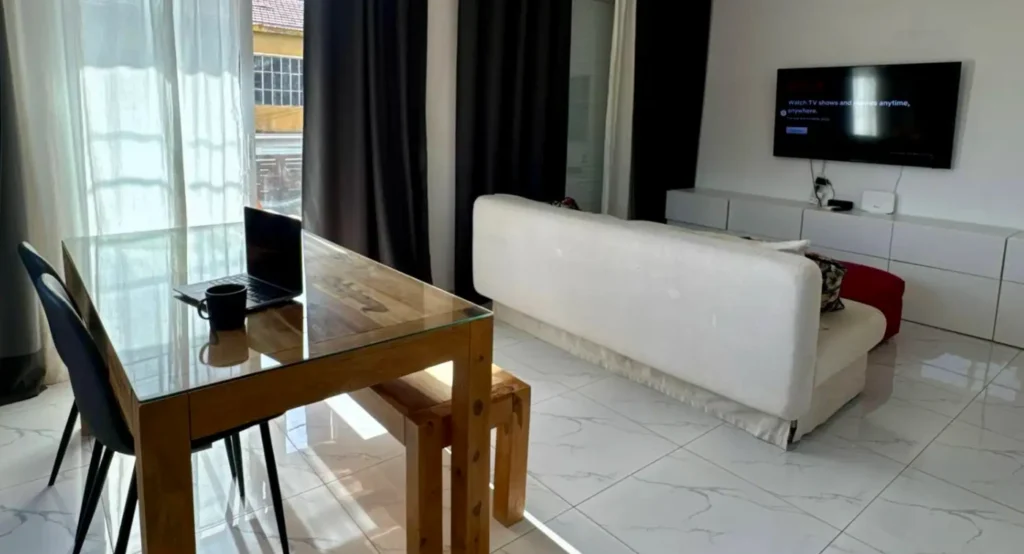 The property is sold with full title deeds and no chain. It is fully furnished and move-in ready, including all furniture, appliances, blinds, and curtains. The kitchen is equipped with modern Bosch appliances and a washing machine. The open-plan living area features stylish, high-quality furniture from COCO-MAT and Kare Design, a smart TV, fast internet, and a large desk suitable for remote working.