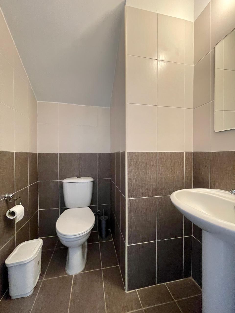 This delightful townhouse boasts a small private yard and two balconies, providing ample outdoor space for relaxation or entertainment. With a functional layout, the ground floor includes a cozy living space, dining area, and a kitchen with direct access to the yard, along with a convenient guest WC. On the first floor, you will find two comfortable bedrooms that feature balcony access, a family bathroom with a shower, and a master bedroom with its own en-suite bathroom, ensuring privacy and comfort for all occupants.