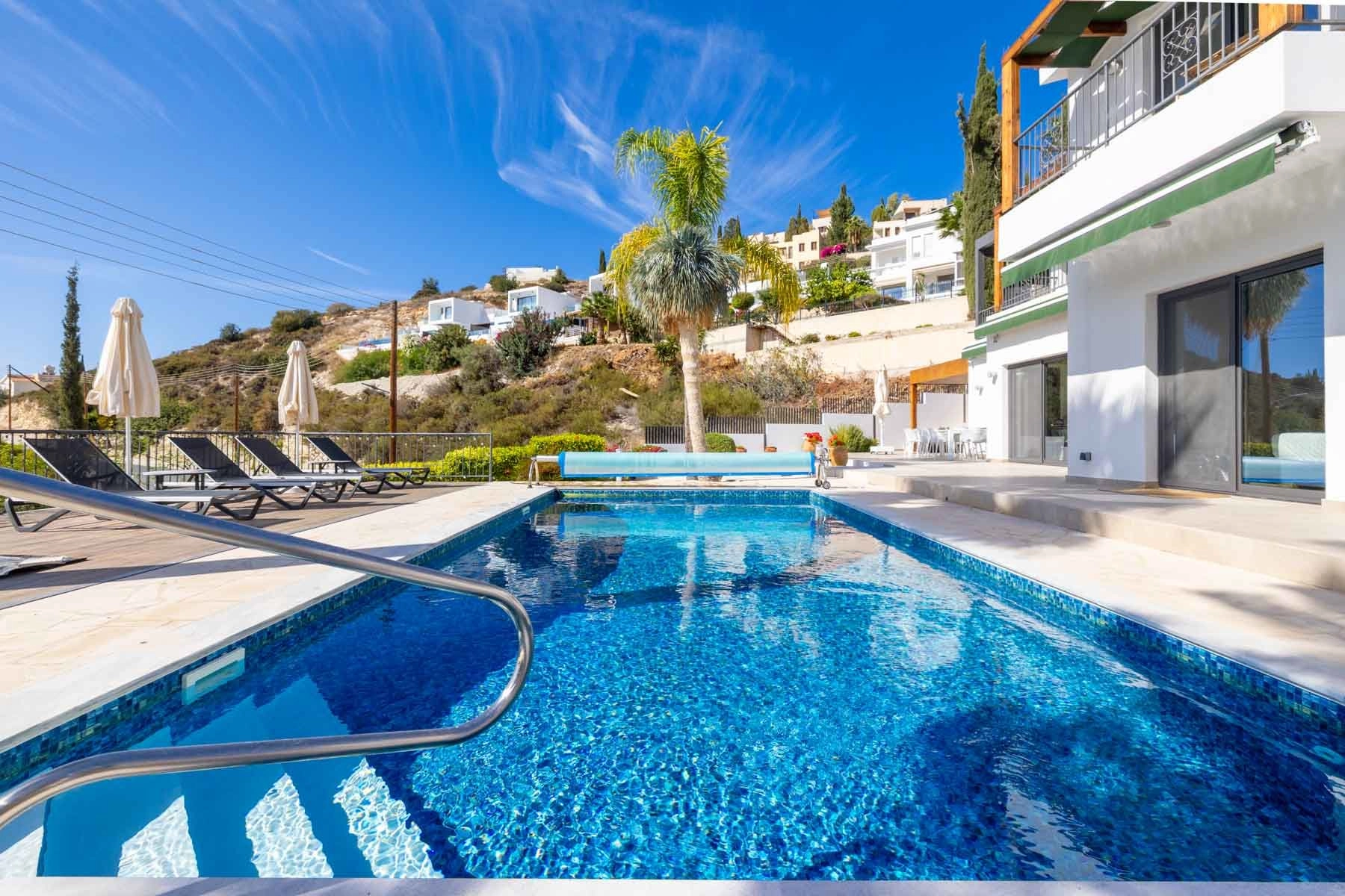 Experience comfortable living in this stunning 4-bedroom, 4-bathroom home with panoramic sea views from every level. The spacious living and kitchen areas open to an expansive outdoor veranda and a heated pool, inviting seamless indoor-outdoor entertaining. On the first floor, two en-suite bedrooms provide comfort and privacy, while the upstairs hosts a second living area with a cozy fireplace, a large veranda with a hot jacuzzi, two additional bedrooms, and a compact office. A covered parking area for two cars and automatic gates add everyday convenience and security. Exquisitely appointed with high-end finishes, underfloor heating, and a smart home system, this home blends modern convenience with timeless style. A dedicated summer kitchen with a BBQ area overlooks the breathtaking Seaview, perfect for al fresco dining. The matured garden completes the serene, private setting, making it ideal as a forever home. Designed for gracious living and effortless entertaining, this property delivers lifestyle in a premier location. Its elevated position helps mitigate humidity, enhancing comfort year-round.