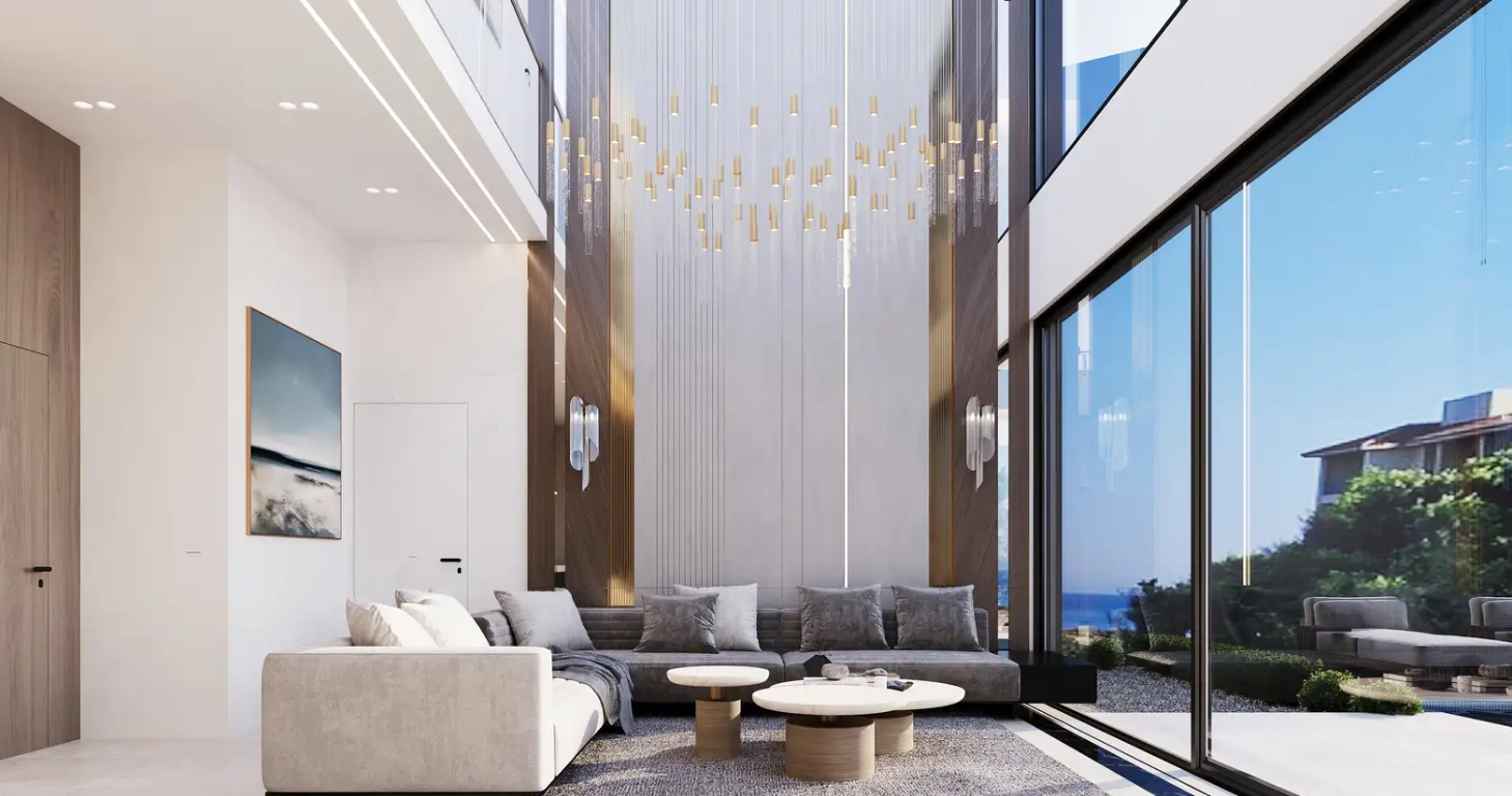 The main living area impresses with a double-height ceiling, creating a sense of openness and light, while the entire ground floor benefits from extra-high ceilings and an airy layout. The open-plan kitchen and living area are finished with elegant materials and designed for contemporary living.