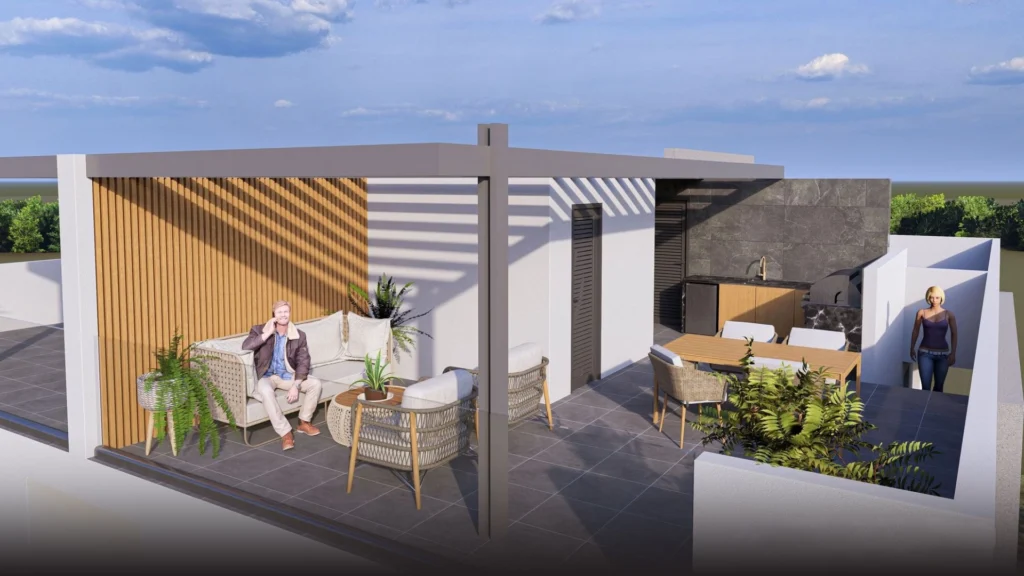 The project boasts eight 2 bedroom spacious apartments. The 4th floor apartments benefit from large covered balconies plus two rooms on the roof with three bathrooms exclusive to owners and a large bar and barbecue area on the roof garden and panoramic views. Each apartment has  an allocated parking place and a storage room.The modern design features top quality Italian ceramic finish, unique glass balconies and clever layout of living areas designed to offer space and views of the neighbourhood and the lake. The Project has EPC certificate with “A” Energy Efficiency Rating.