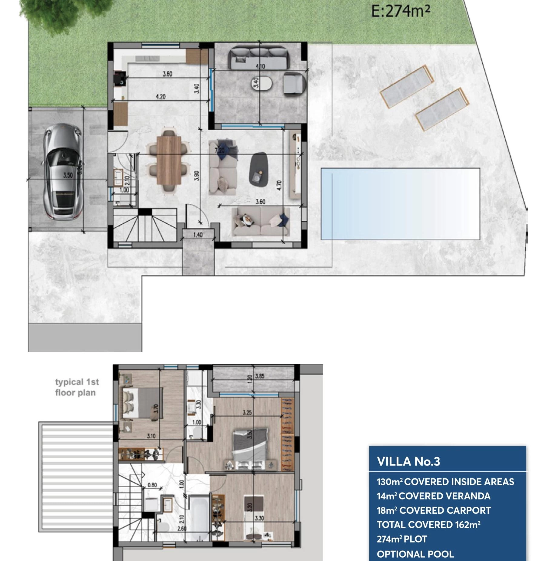 Villa for sale in a modern complex in Larnaca, Xylofagou. The project consists of 7 duplex residences. The house has a spacious open-plan living room and kitchen, 3 bedrooms, 2 bathrooms and a guest toilet, a covered veranda. At the request of the customer, it is possible to install a swimming pool. There is a covered parking for the car. The project is made of high quality materials and is located near the urban infrastructure.