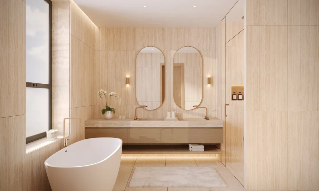 ✔ European sanitary fixtures in all bathrooms (wall-mounted toilets with concealed flush plates — Geberit brand or similar, chrome-plated mixer taps)