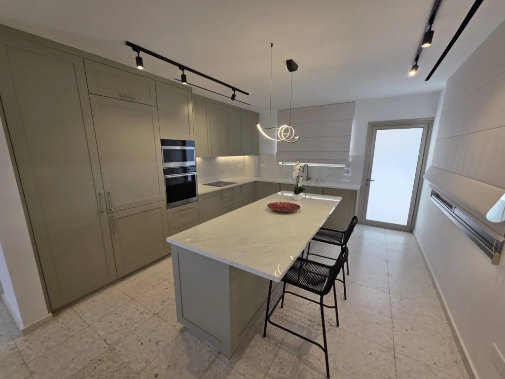 Sale of 5 bedrooms semidetached house in Germasogeya Columbia, Limassol. The house consists of 3 levels – semibasement with open plan kitchen/living area, 2 bedrooms and bathroom, open plan kitchen/living area and guest toilet on the ground floor, 3 bedrooms and bathroom on the first floor. The basement has also separate entrance. There are also storage room, open veranda, small garden and parking.