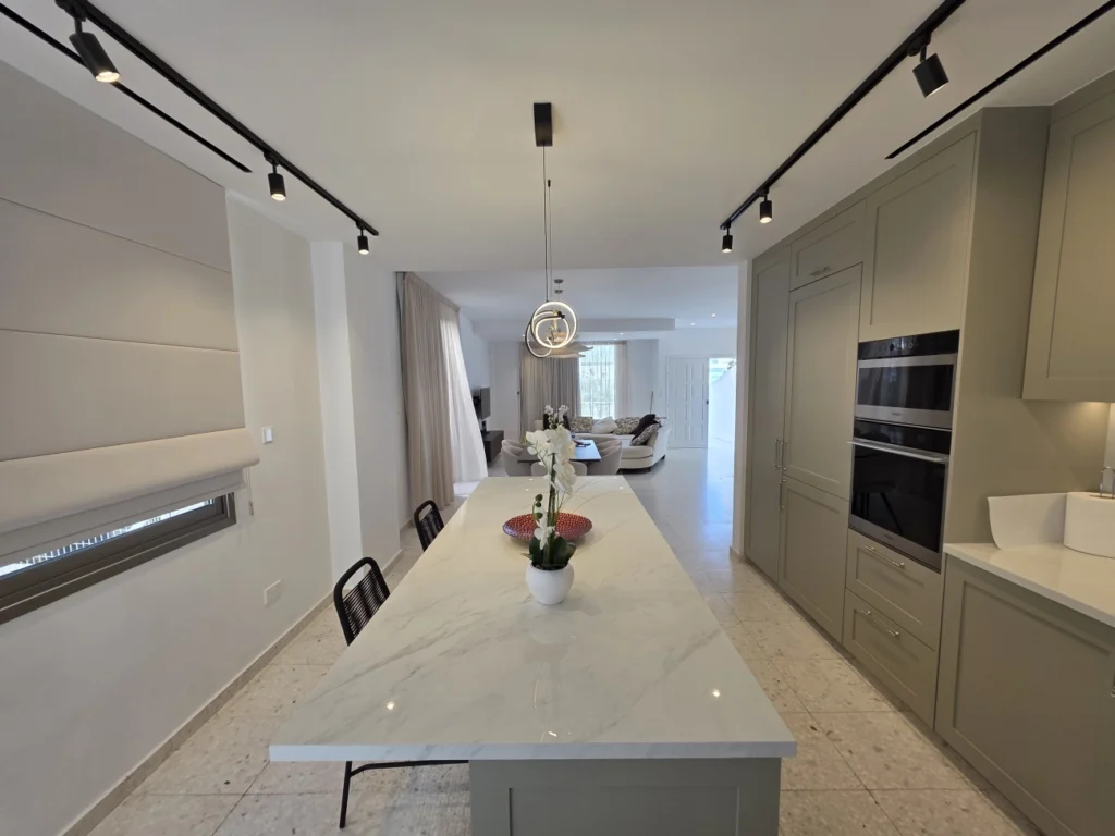 Sale of 5 bedrooms semidetached house in Germasogeya Columbia, Limassol. The house consists of 3 levels – semibasement with open plan kitchen/living area, 2 bedrooms and bathroom, open plan kitchen/living area and guest toilet on the ground floor, 3 bedrooms and bathroom on the first floor. The basement has also separate entrance. There are also storage room, open veranda, small garden and parking.