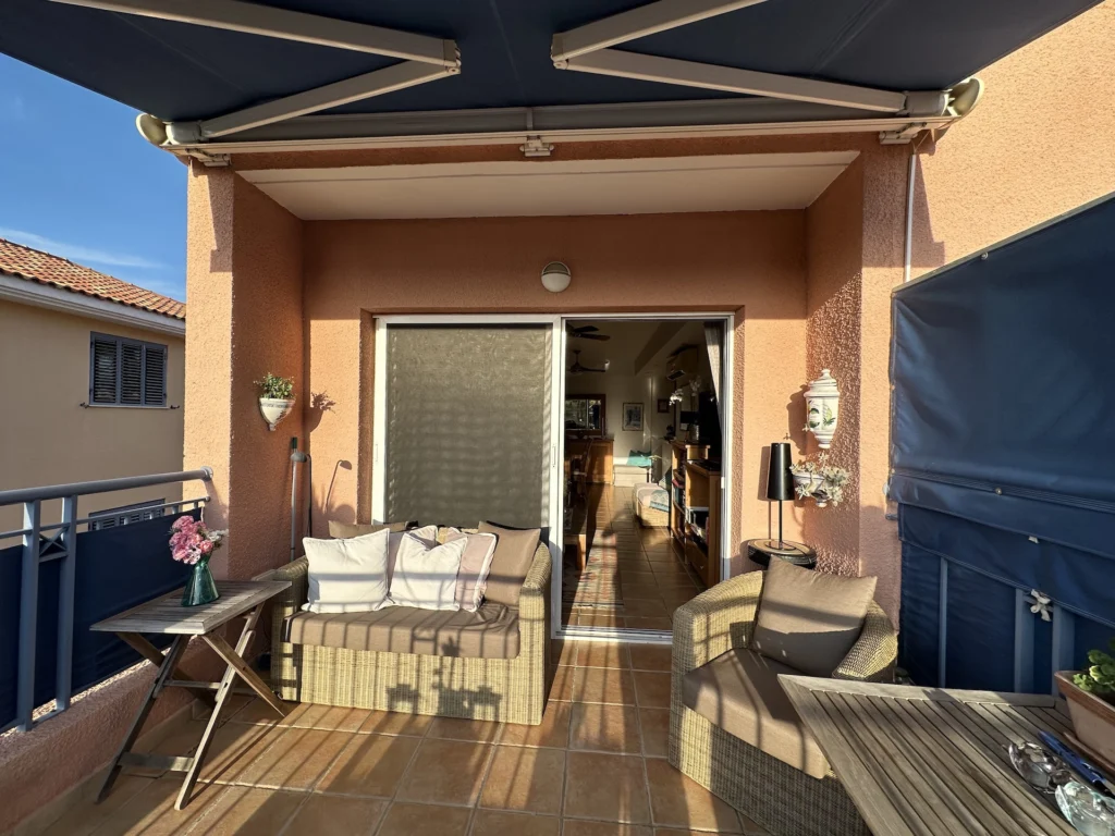 Situated on the 2nd floor, the property benefits from abundant natural light due to its corner positioning. The open-plan living and dining area connects to a fully equipped kitchen and opens onto a covered veranda overlooking the pool and garden courtyard.