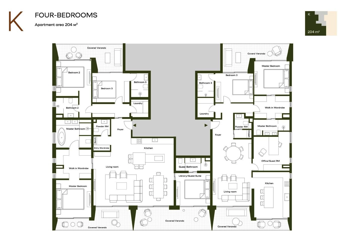Four-bedroom apartment 6, with a living area of 204 m², is located on the second floor of a six-storey building C.