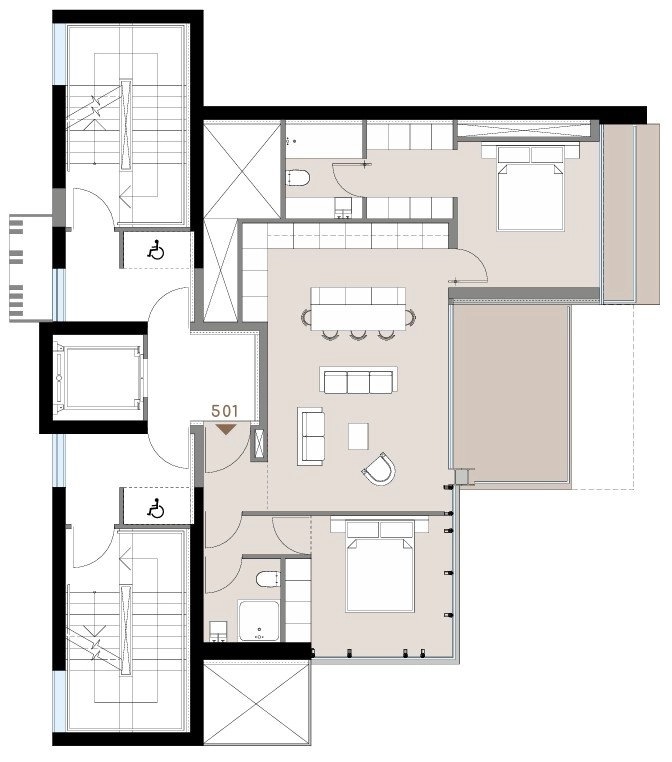Interiors are defined by light, space, and calm sophistication. Open-plan living areas flow effortlessly onto private verandas, while beautifully crafted kitchens and tranquil bedrooms invite relaxation. Residents enjoy the comfort of secure access, private parking, and high-speed elevators—all within a serene, boutique environment designed for modern living.
