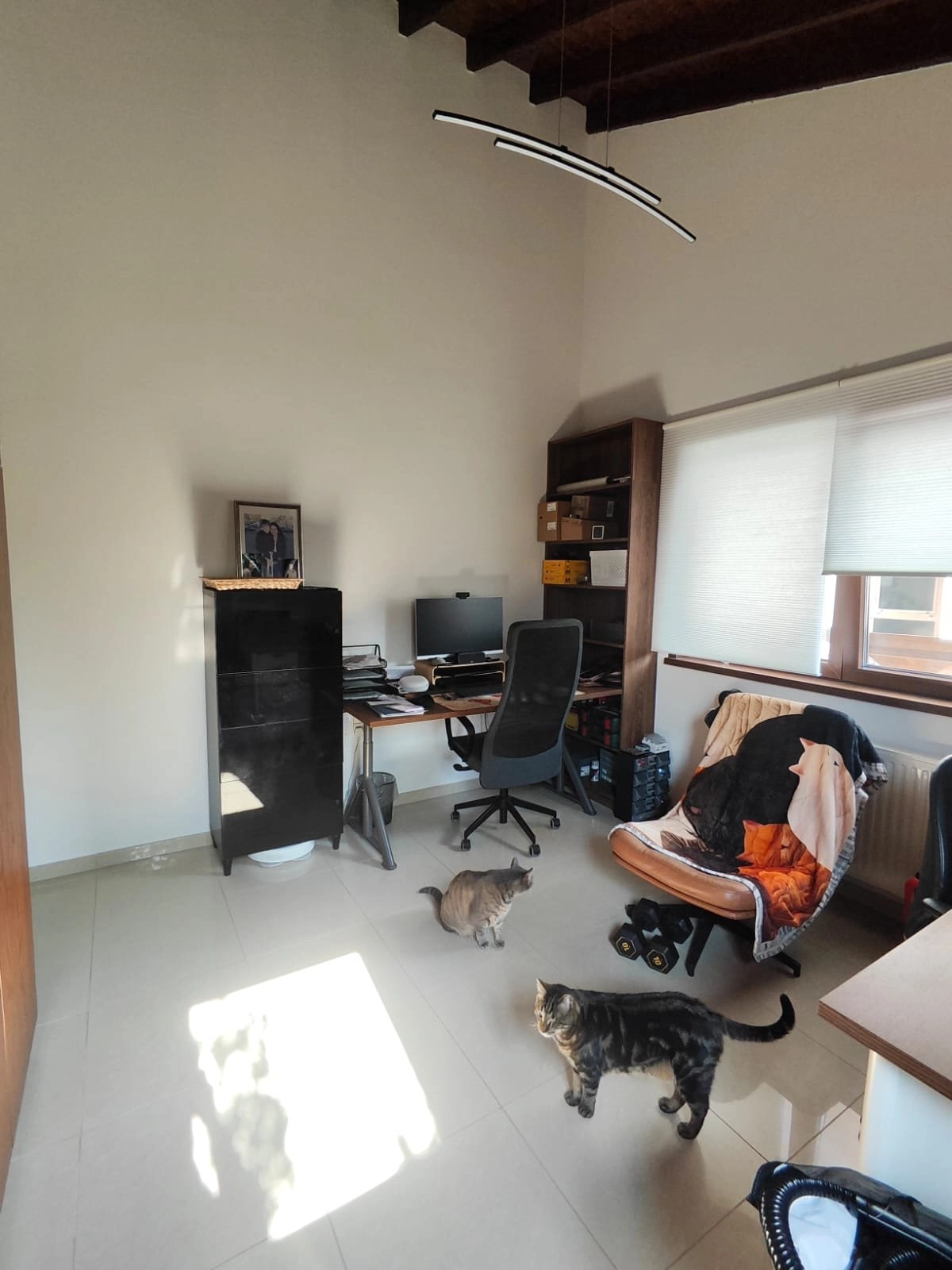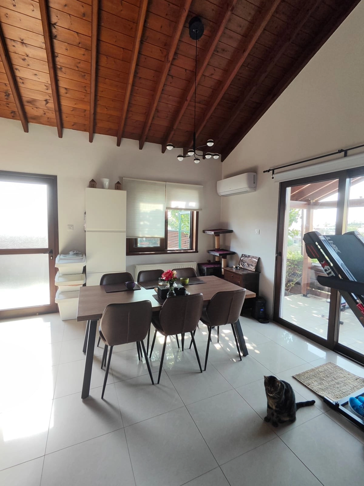 The house has a lovely covered veranda facing the sunsets, a small fruit garden, and a mature royal rose bush with a rich fragrance. There’s also a separate enclosed outdoor storage area and a safe, enclosed patio for cats (around 9 m²) with access directly from the dining area window – a little paradise for pets.