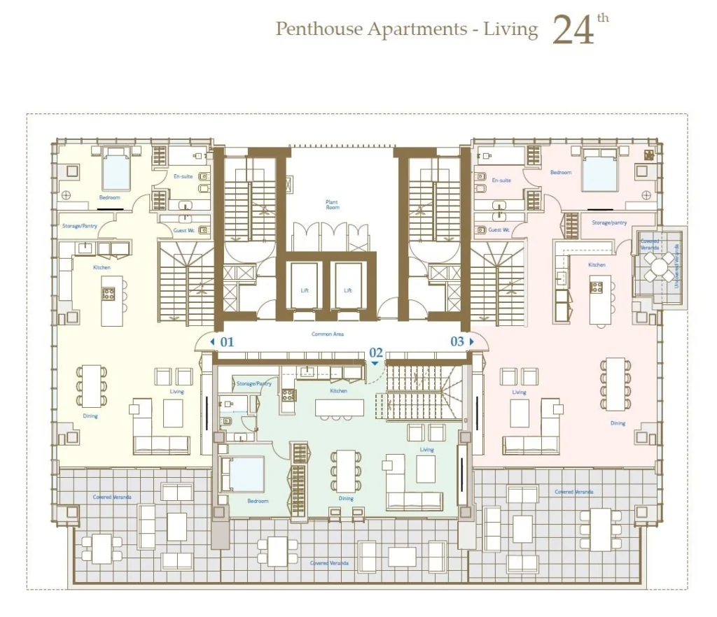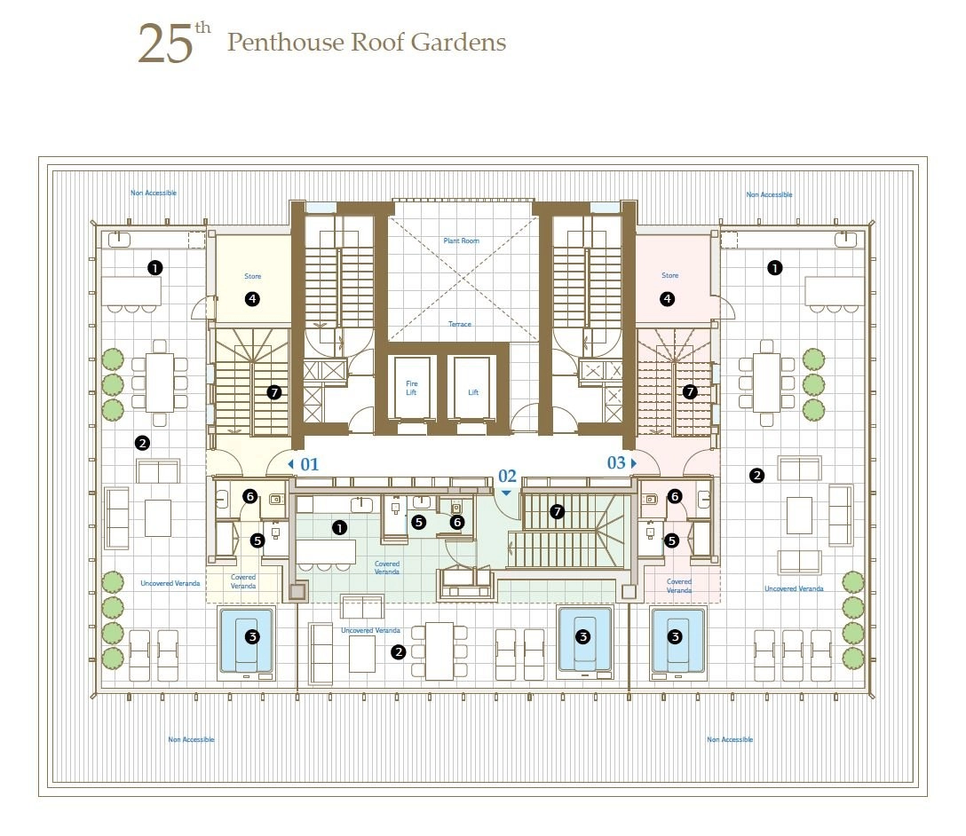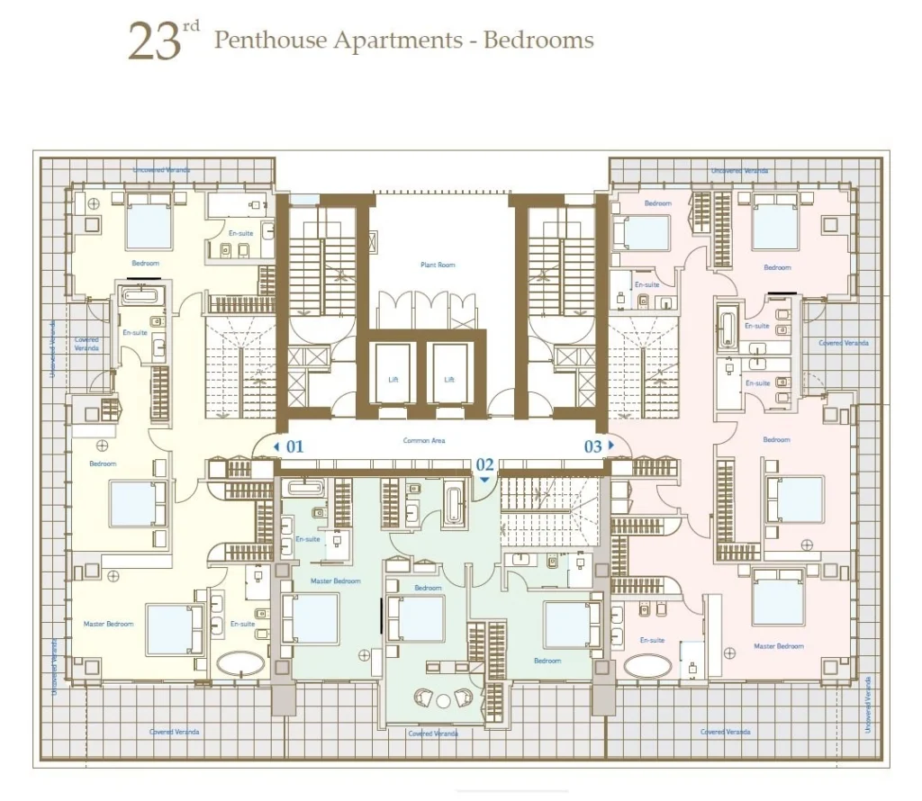 Four-bedroom penthouse 2301, with a internal area of 284 m² and roof garden, is located on the twenty-third floor of a twenty-five-storey building.