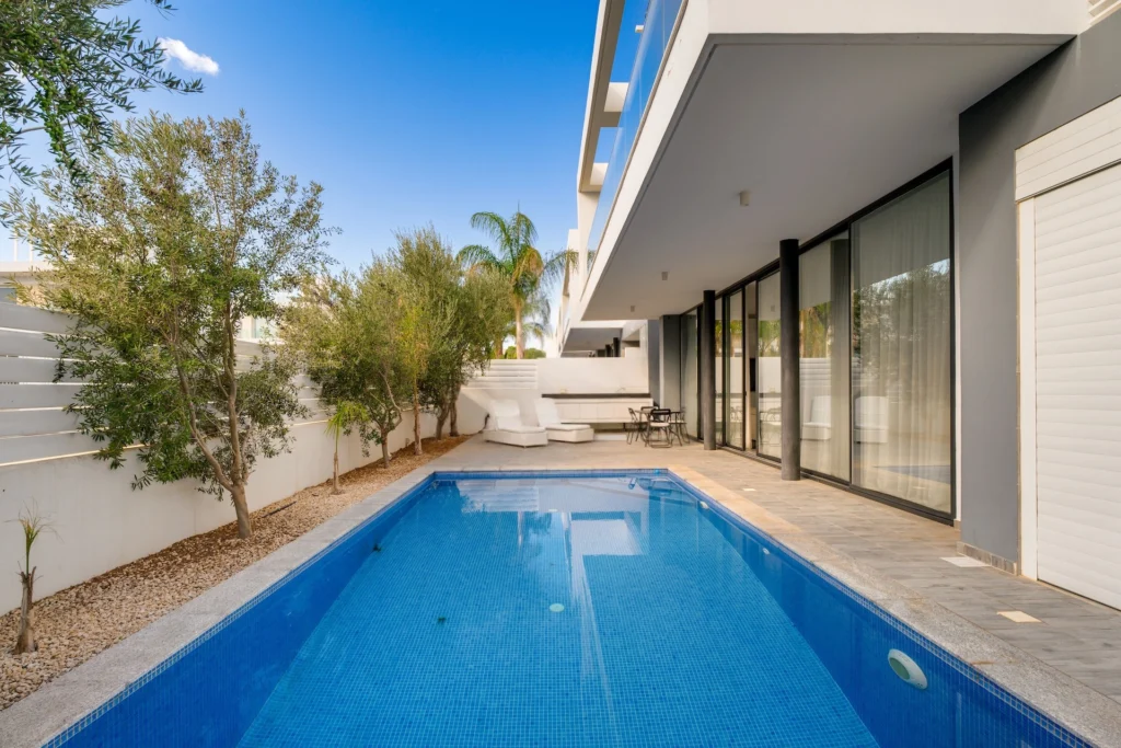 Three-bedroom villa of 136 m2 for sale in Protaras, Famagusta. The residence includes three spacious bedrooms, two modern bathrooms, three bathrooms, a kitchen combined with a dining area, a bright living room, an internal staircase, a covered veranda of 35 m2, an open veranda of 50 m2, as well as a plot of 260 m2 with a well-maintained garden and a private heated swimming pool. There is a covered garage for two cars with electric gates on site. The villa is fully furnished, equipped with kitchen appliances and modern engineering systems, including 3.3 KW photovoltaic panels, solar water heater, split units, smart home system, alarm system, surveillance cameras, access control system, barbecue area and outdoor shower. The villa features panoramic views of the sea, the countryside, rural landscapes and open spaces, which are viewed through large windows and thoughtful exterior areas. The facility has energy efficiency of class A+. The property is located in a quiet cul-de-sac, in an area with convenient access to the highway and quick access to the main roads. The sea is 500 m away, the public transport stop is 600 m away, shops are 400 m away, the resort infrastructure is 600 m away, schools are 5 km away, the airport is 60 km away.
