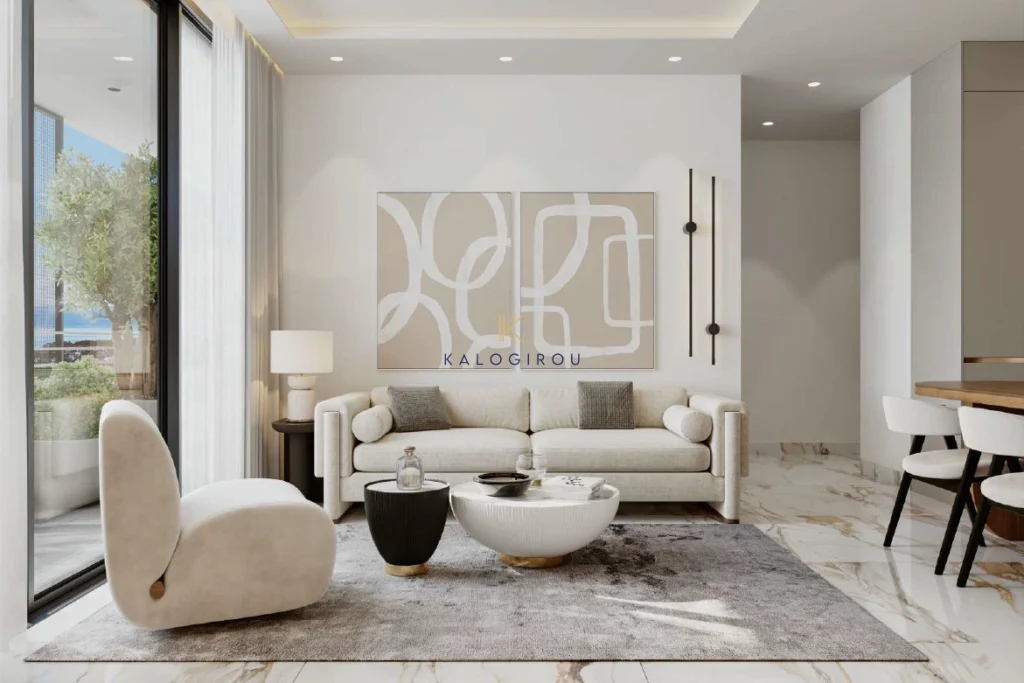 Top Floor, Two Bedroom Flat with Roof Garden for Sale in Oroklini area, Larnaca. The property is situated near the Mediterranean Sea and only minutes from Larnaca International Airport, offering easy
