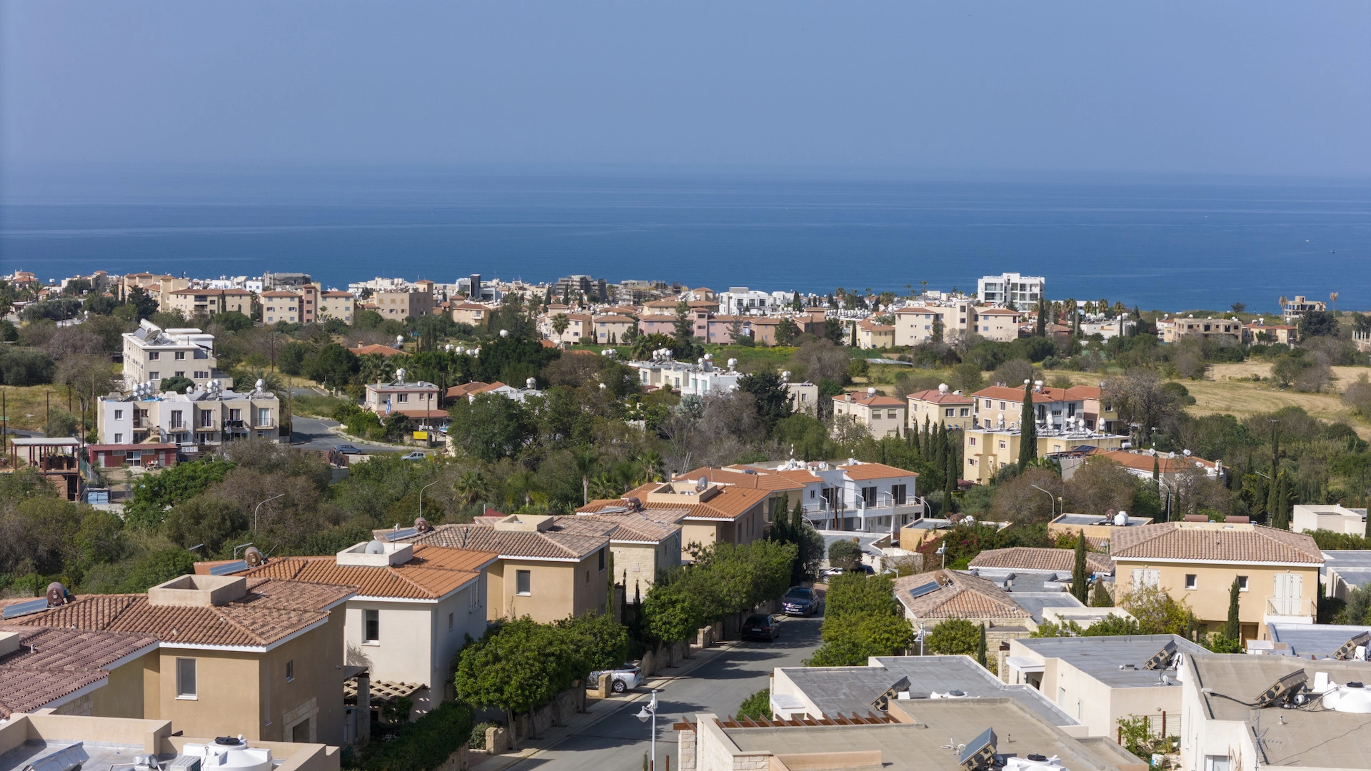 The residential community is situated on a hilltop in Chloraka, just a short walk from the Paphos coastline and the Mediterranean Sea.