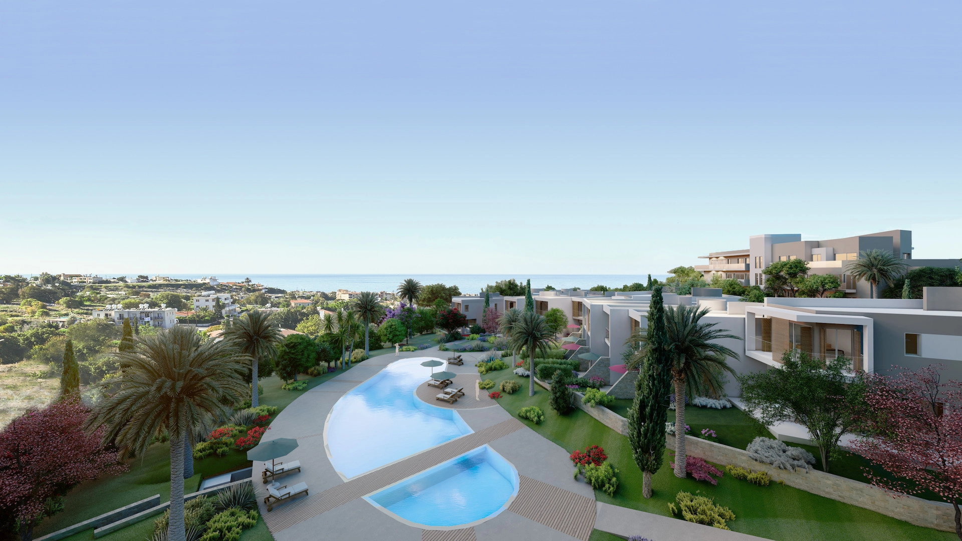 The residential community is situated on a hilltop in Chloraka, just a short walk from the Paphos coastline and the Mediterranean Sea.