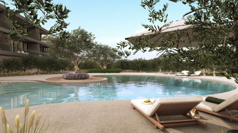 Apartment for sale in Anarita area, Paphos. There are only 150 apartments in the residential complex, and each apartment is designed as a secluded vacation spot, combining elegance, comfort and technology. The spacious open-plan apartments have large verandas offering panoramic views of the sea, mountains and surrounding olive groves. The interiors are made to the highest standards using exquisite Italian materials, smart home technologies and modern design combining sophistication with the comfort of life. Ceiling height: 2.70-2.75 m.Set in landscaped gardens with over 400 olive trees, residents have access to resort-level facilities: three swimming pools, padel courts, a fitness center and wellness areas.The residential complex is located in a quiet location, surrounded by nature, but only minutes away from everything you need. In less than 10 minutes you can reach beaches, world-class golf courses, private schools, an international airport, modern medical facilities and a full range of shops and services. Closer to the house is the village of Anarita, which will delight with its traditional charm, local taverns and a warm atmosphere.