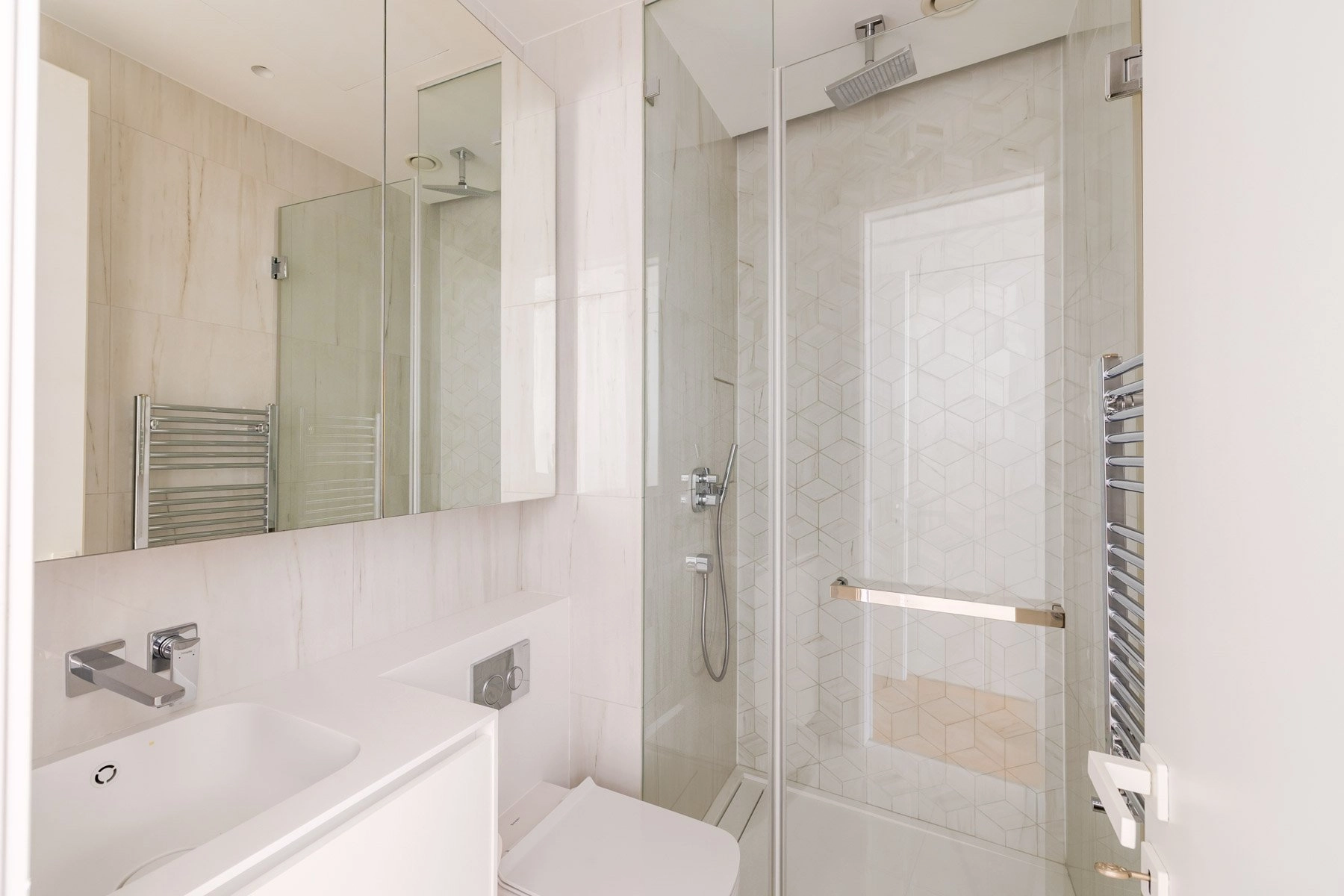 Inside, the apartment features a practical and spacious layout. Both bedrooms provide quiet, private spaces to unwind. The master bedroom includes a walk-in wardrobe and an en-suite bathroom, creating a comfortable personal retreat. The second bedroom is served by a separate bathroom, while the guest toilet adds extra convenience for visitors.
