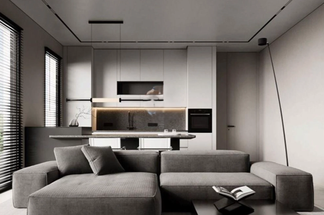 It comprises a spacious living area with an open kitchen space, one bedroom, and one bathroom.