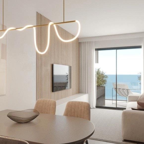 The open-plan living and dining area creates a bright and welcoming atmosphere, seamlessly connected to a private veranda that extends the living space outdoors. The kitchen is individually designed, combining practicality with style, while large openings ensure plenty of natural light throughout the day.