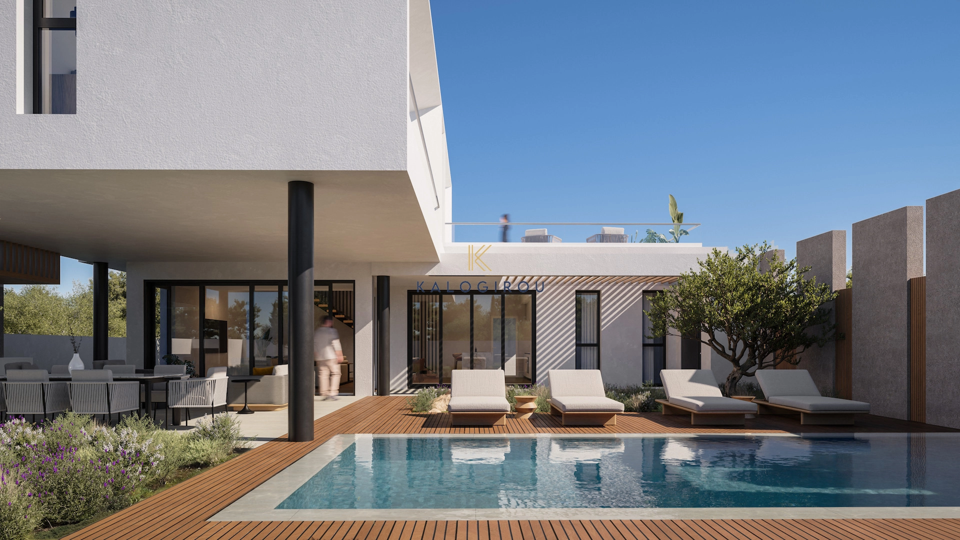 Double story house for sale in Livadia area, Larnaca. It has internal covered area of 200 sqm. On the ground floor the residence consists of a living/dining/ kitchen with island in an open layout and en suite guest bedroom. The upper floor consists of three bedrooms plus a master en suite bedroom with private veranda access (uncovered), a main bathroom and a common balcony. Externally, there is private swimming pool, garden, bbq area, shower room and covered parking for two cars.