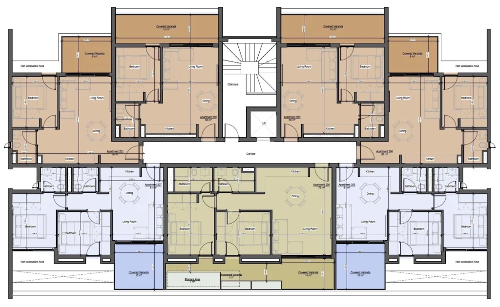 Two-bedroom apartment 207, with a living area of 61 m², is located on the second floor of a three-storey building.