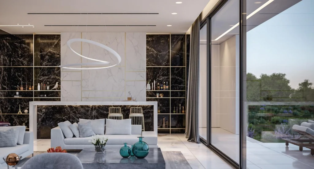 New, luxury 6 bedroom villa for sale in Germasogeia, Limassol. Open-plan kitchen/living room. The house has an elevator. All bedrooms have their own bathroom, and the main one also has a dressing room. A separate room designed for an office. 33 m2 of open verandas. There are 3 parking spaces (one at the house and two in the basement). 2 swimming pools (one in the yard and one in the basement). It will be built on a large plot of 888 m2. Gym. It has easy access to the motorway and the sea.