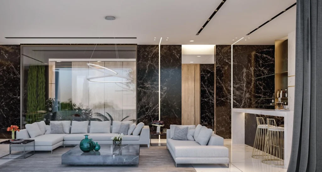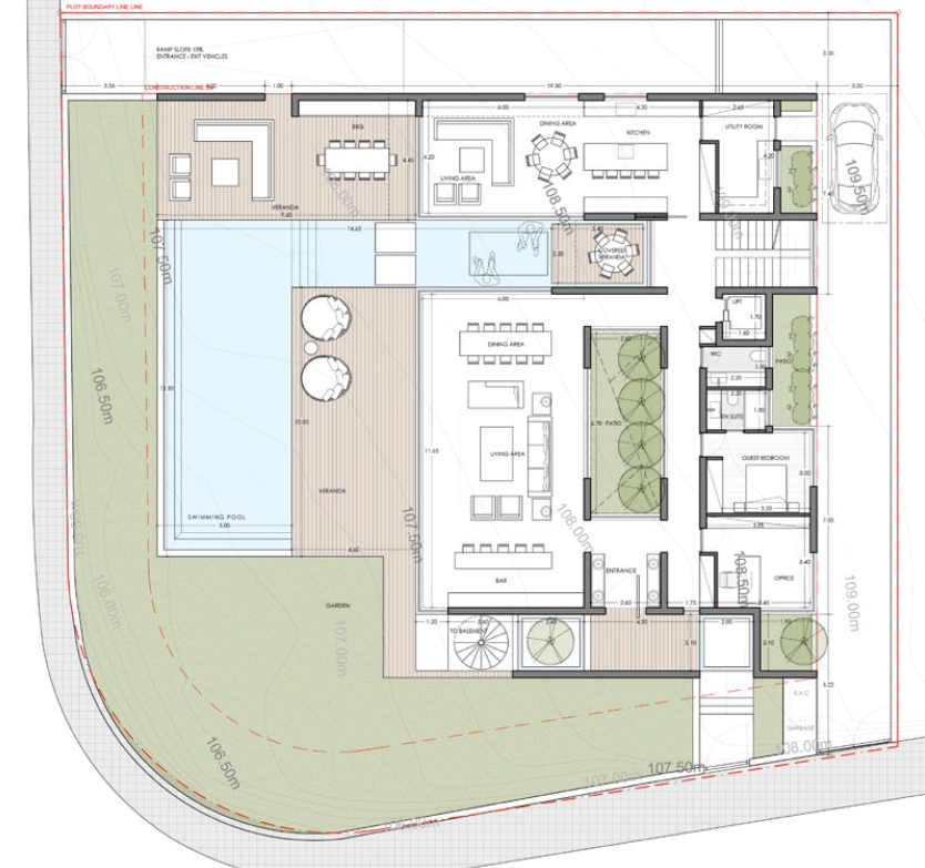 New, luxury 6 bedroom villa for sale in Germasogeia, Limassol. Open-plan kitchen/living room. The house has an elevator. All bedrooms have their own bathroom, and the main one also has a dressing room. A separate room designed for an office. 33 m2 of open verandas. There are 3 parking spaces (one at the house and two in the basement). 2 swimming pools (one in the yard and one in the basement). It will be built on a large plot of 888 m2. Gym. It has easy access to the motorway and the sea.