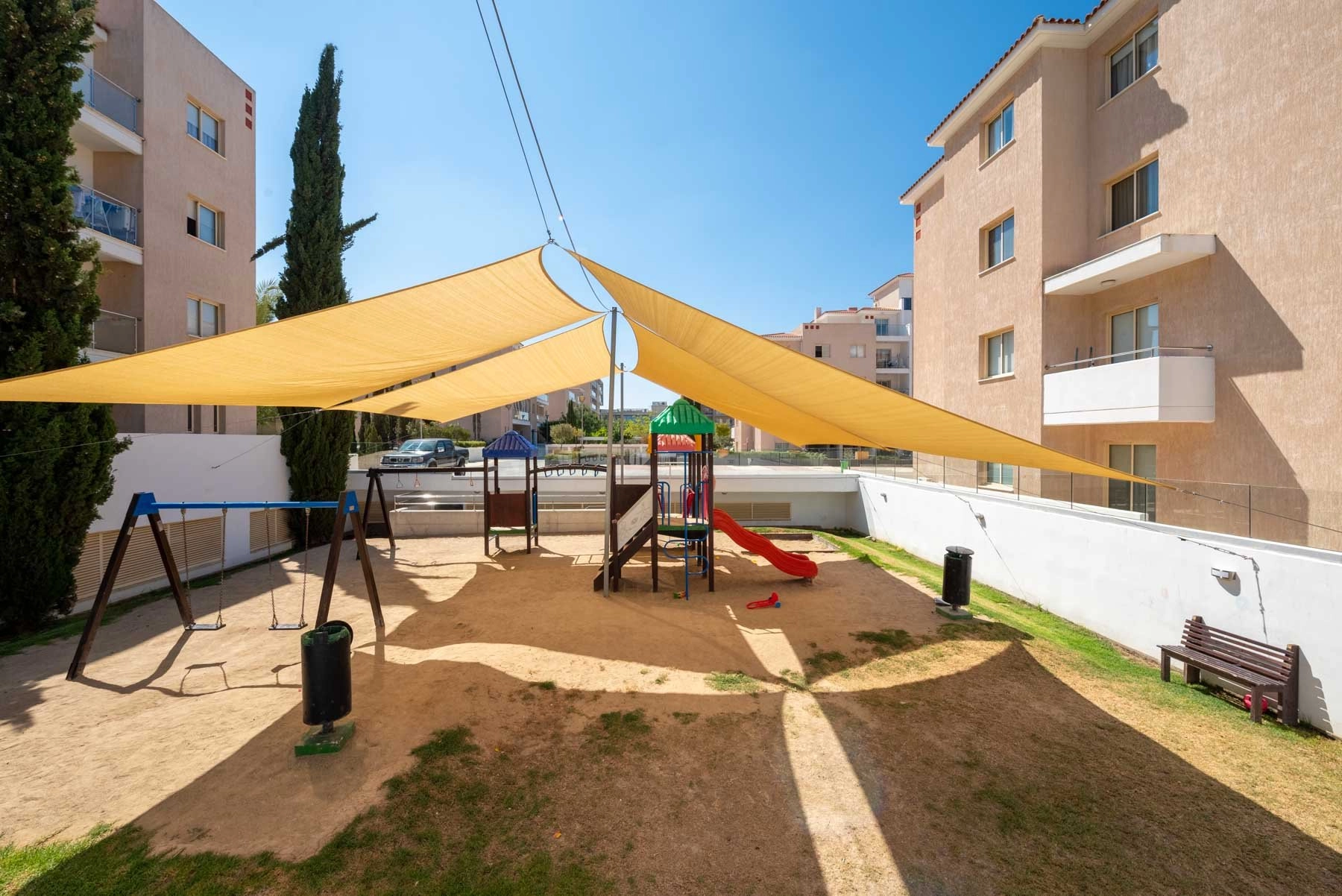 This top-floor two-bedroom residence is situated within one of Paphos’ most sought-after gated developments — a community known for its resort-style facilities and excellent location in the Universal area. Residents enjoy access to hotel-level amenities, including infinity pools, a fully equipped gym, a café, a sauna, children’s play areas, landscaped communal spaces, 24/7 security, a pharmacy, a minimarket, and a welcoming reception.