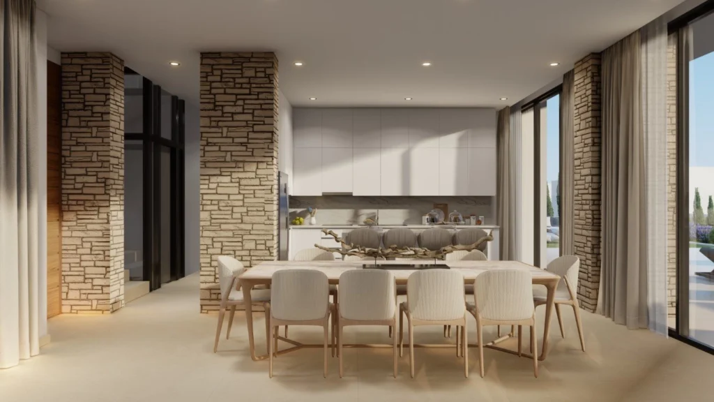 The villas are of a contemporary style and design with timeless elegance. Each villa offers the luxury of its own garden and enjoys a private pool and parking. The shapes and materials such as natural stone are locally inspired but are interpreted to form a creative and harmonious whole.