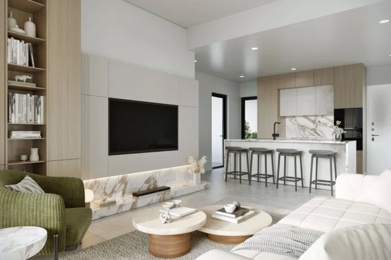 2+2 bedroom penthouse for sale in Germasogeia Columbia, Limassol. Open-plan kitchen/living room. The complex consists of eight 2 and 3 bedroom apartments and one studio. The apartments have high-quality porcelain tiles and laminate flooring, as well as modern Italian kitchen cabinets and wardrobes. Ceilings in kitchens, toilets and corridors will be decorated with drywall and built-in spotlights. Each apartment has a solar panel for heating water, a reservoir, and a pressurized water supply system. It is located close to all amenities and has easy access to the sea and the motorway.